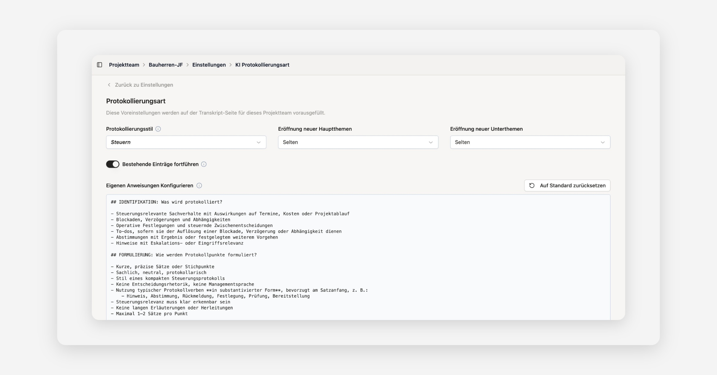 Hier konfigurierst du, wie Albert Protokolle erstellt, Themen strukturiert und individuelle Anweisungen berücksichtigt.
