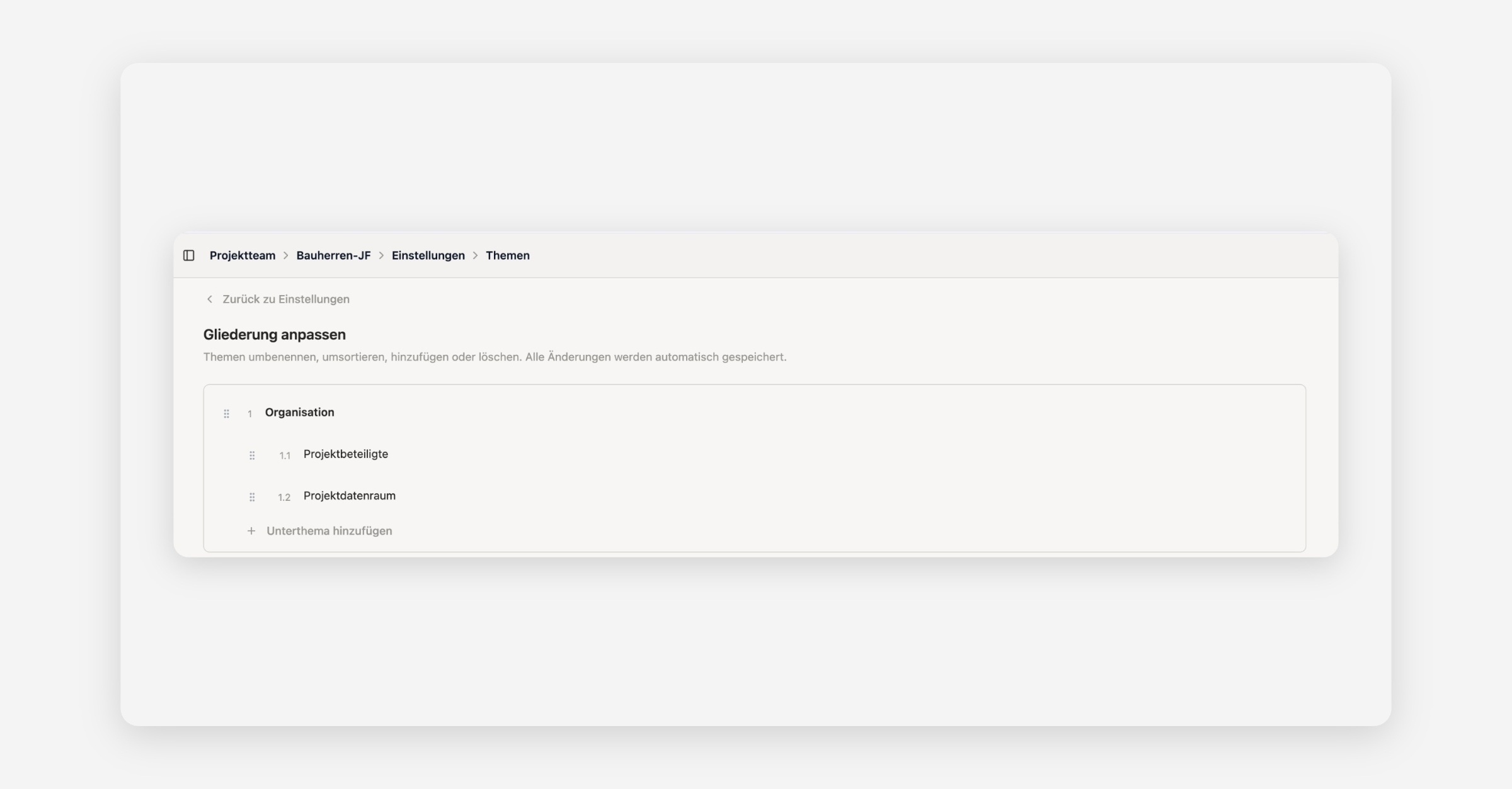 In den Themen-Einstellungen kannst du die Gliederung der Themen im Projektteam anpassen. Themen dienen als Struktur für Protokolleinträge. Die Themen können sowohl in den Einstellungen per Drag&Drop und auch direkt im Protokoll angepasst werden.