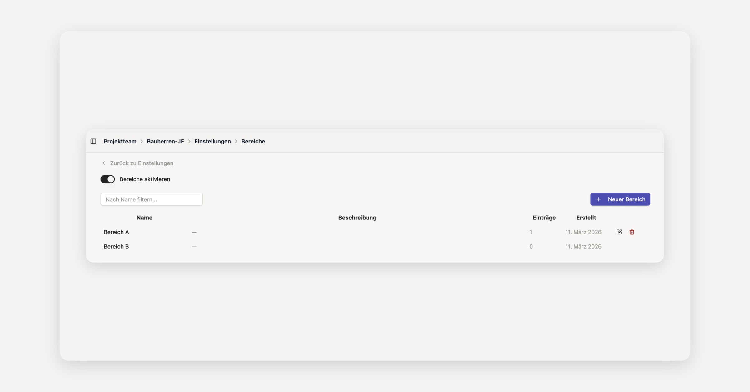 In den Bereich-Einstellungen kannst du festlegen, ob Bereiche im Projektteam verwendet werden sollen und neue Bereiche anlegen.