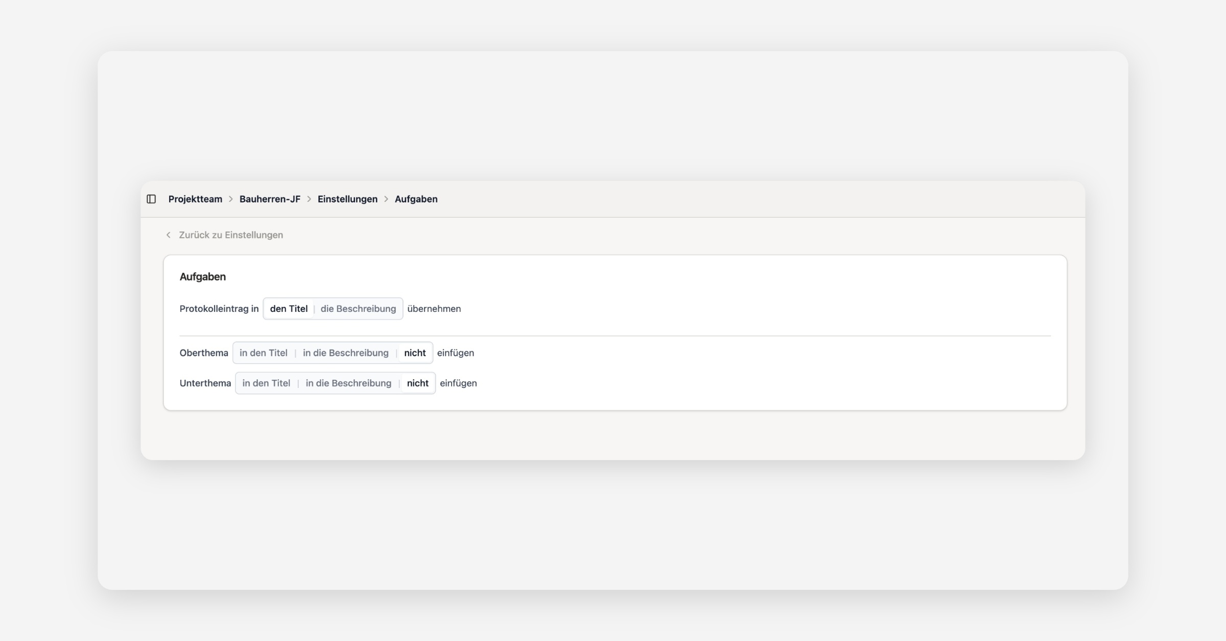 In den Aufgaben-Einstellungen kannst du festlegen, wie Aufgaben aus Protokolleinträgen in das Aufgabenmanagement übernommen werden.